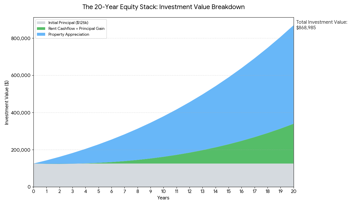 Total Investment Value: $868,985 (This includes your $125k initial principal, rental gains, and market appreciation).