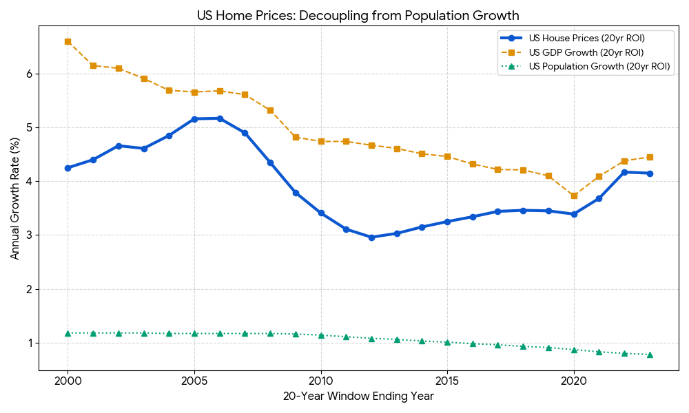 What to look for in this graph: Notice how the green line (Population) is sliding toward zero, while the thick blue line (House Prices) stays tethered to the orange line (GDP). This visually proves that as long as the American economy produces more value, home prices have a foundation to rise, regardless of how many people are in the country.
